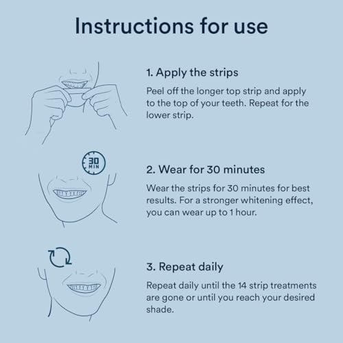 - [USE FOR 30 MINUTES PER DAY] For best results, we recommend wearing the strips for 30 minutes per day and avoiding eating or drinking 1 hour after use. For a deeper whitening effect, you can also wear the strips up to 1 hour per day.