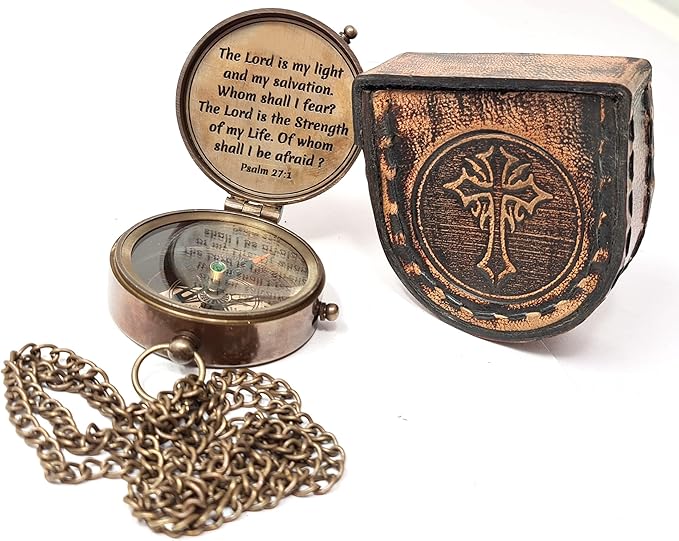- Product Specifications: The compass and case set have a religious message engraved on one of its sides. The compass has “The Lord is my light and my salvation. Whom shall I fear? The Lord is the strength of my Life. Of whom shall I be afraid? – Psalm 27:1” written on it. The compass measures 2.36 x 1.97 x 0.71 inches and weighs120 gms.