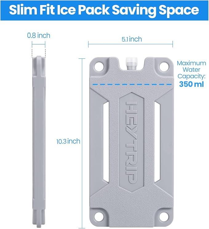 - Slim-Fit & Space Saving - Best size for cooler: 10 x 5 x 0.8 inch. Instead of putting ice cubes into the cooler and wasting space, try Heytrip slim-fit ice pack. Heytrip reusable ice packs for cooler bag with slim-fit design save space for a least three tins of coke in a cooler bag, perfectly fit your cooler bags, lunch boxes, and picnic baskets.