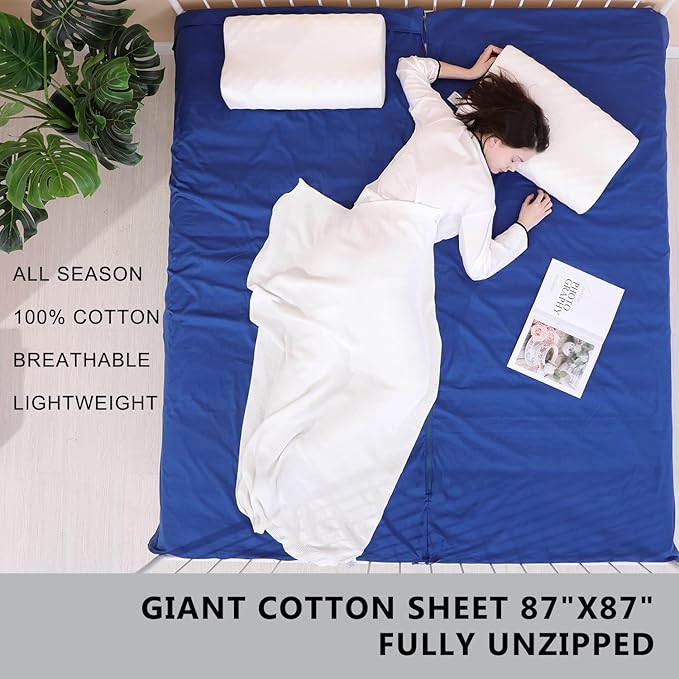100% Cotton Sleeping Bag Liner with Full Length Zipper on 3 Sides; Single/Double Adult Sleep Sack for Travel & Camping, Multifunctional Travel Sheets (Unzipped 87”x87”) for Hotel, Lightweight