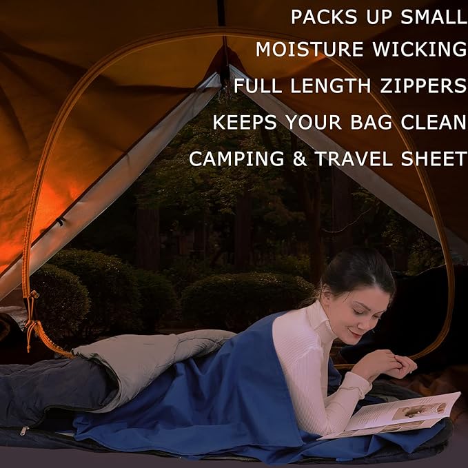 • This premium sleeping bag liner is made of an excellent quality cotton and the seams are very well constructed. The raw edges are encased in French seams rather than simply being zig-zagged to prevent fraying. This cotton fabric is soft, breathable, strong, healthy, easy to clean, long lasting, it adds another layer of extra 10°-15°F warmth when you need it. 100% Cotton is non irritating to even the most sensitive skin.