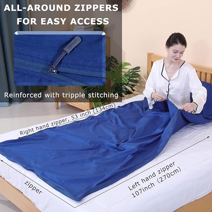 • This XL sleeping sheet provide you with comfort when traveling. It’s wide (87x43 inches) and allows you to turn inside it without being twisted. Full-length zippers run along left, right side and also the bottom of the sheet, which enables you to get in and out of easily from any side of your bed, stretch your feet out of the bag for comfort. This multifunctional sleep sack also turns into one giant cotton bed sheet (87X88 inches) when fully unzipped. The pocket keeps your pillow in place.