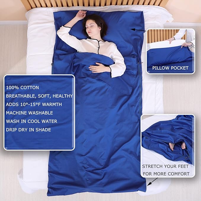 • Bring this travel sheet with you whenever you travel because the bleach on some hotel sheets is too harsh. No matter where you travel to the world, no matter what season, this cotton sleeping bag will make you feel like sleeping on your own cotton sheets at home, cool, clean, comfortable and safe.