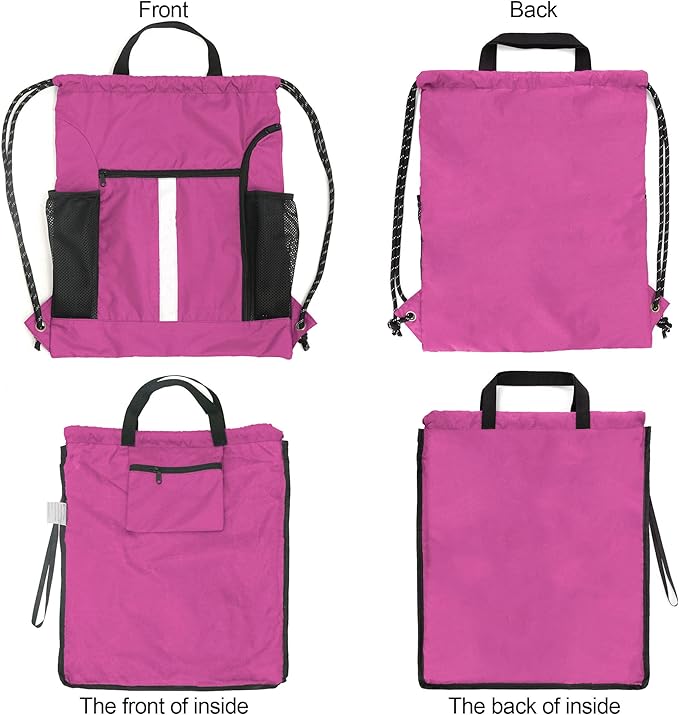 - Convenient Compartments: The big shoe compartment on the right side of gymsack drawstring backpack can hold two pairs of shoes. The front zipper pocket is roomy to fit a kindle, iPad, sunglasses, and other small items. The inside pocket can hold small valuables such as wallet, cellphone, keys to avoid any pickpockets. And two mesh pockets can carry water bottles, umbrella, sunscreen. Etc. This string backpack for women also can be used to store small items.