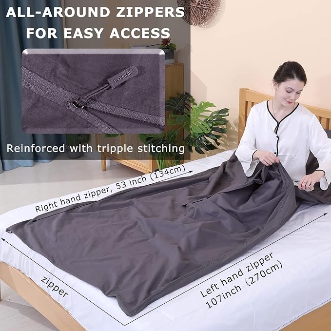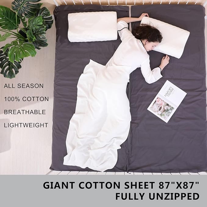 - This XL sleeping sheet provide you with comfort when traveling. It’s wide (87x43 inches) and allows you to turn inside it without being twisted. Full-length zippers run along left, right side and also the bottom of the sheet, which enables you to get in and out of easily from any side of your bed, stretch your feet out of the bag for comfort. This multifunctional sleep sack also turns into one giant cotton bed sheet (87X88 inches) when fully unzipped. The pocket keeps your pillow in place.