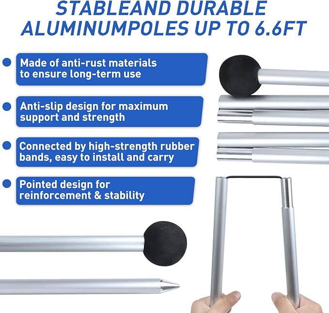 - Quick and Easy Outdoor Setup - Each Zeepair beach tent comes with stability poles, anchors and windproof ropes that let you use it over sandy beaches,thick grassy areas, or even in rocky camping spots. Equipped with sand shovel to quickly hold large amount of sand to anchor and overfill all 4 sandbags.Foldable thickened rust-resistant aluminum poles has a pointed stake at the bottom can stick them straight into the sand or ground.The sturdy EVA foam ball on top of the poles won't tear the fabric