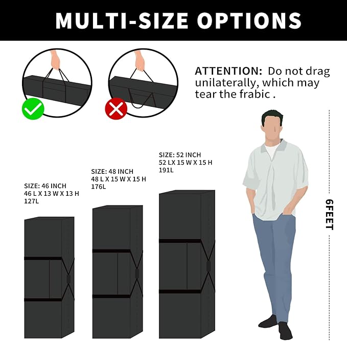 • MULTIOURPOSE:Travel Duffle Bag can be used for travel, snorkeling, baseball, self-driving trip,camping,moving and other outdoor activities. Besides, it can be also used for home storage such as pillows, quilt, clothes, disassembled Christmas tree etc.