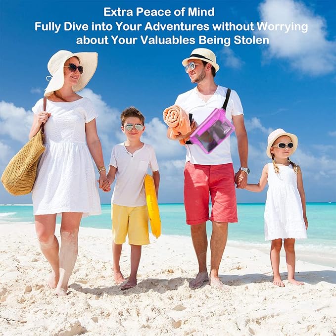 • Beach Accessories for Vacation: Waterproof Protection and Confident Impermeable! Triple zip lock protection up to 32 feet (10 meters) underwater. No worries of your valuables getting wet. Keep your phone and wallet perfectly dry and safe from a splash, a spill, or total immersion whether you're snorkeling, swimming, sailing, paddle boarding, tubing, kayaking, river rafting, water slides or water activities and the like!