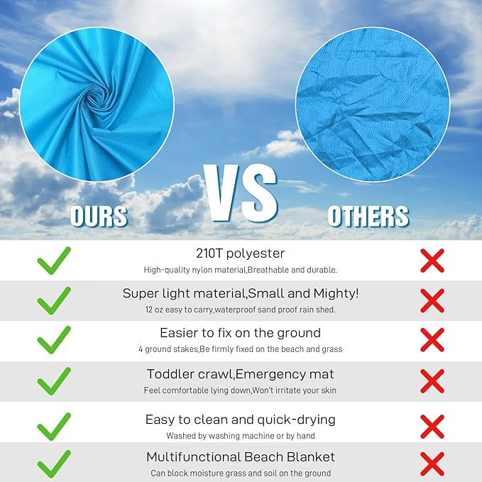 - 🏖️Beach Blanket Waterproof Sandproof:78''×81''size beach blanket,suit for 1-5 adults in total,odorless,made by parachute fabric.Rip-stop 210T polyester,light weight and small after folding.12 oz easy to carry,small and mighty!