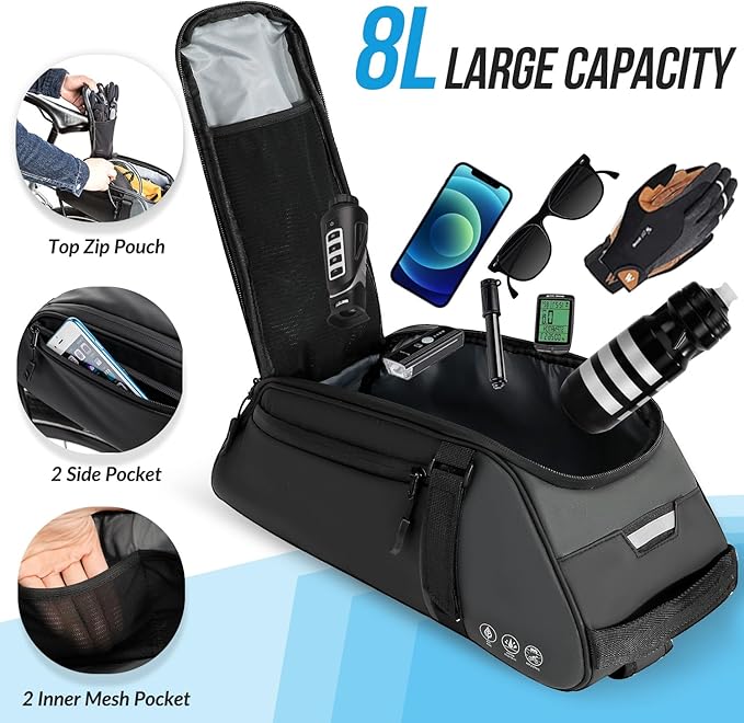WOTOW Reflective Rear Rack Bag, Water Resistant Bike Saddle Bag Panniers for Bicycles, 8L Trunk Storage Bag, Cycling Back Seat Cargo Carrier Pouch With Shoulder Strap (With Rain Cover)