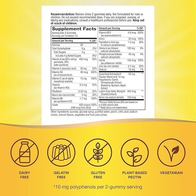 • Women chew 2 gummies daily. Delicious mixed berry flavored gummies make taking your vitamins fun.