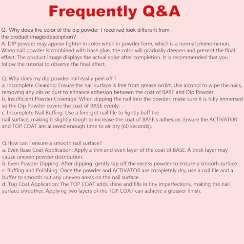• DiP powder tends to have a lighter color when in powder form, which is a normal phenomenon. When combined with the base adhesive, the color will gradually deepen and present the final effect. The product image displays the actual color after completion; Different displays/lighting may affect color perception