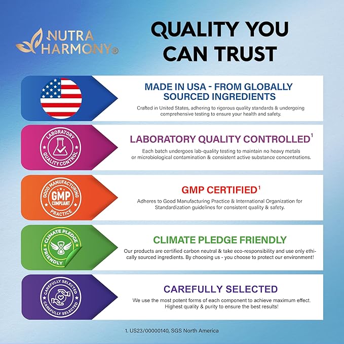 • Trustworthy Service — We are committed to providing exceptional customer service and transparency with NUTRAHARMONY’s carefully selected joint support supplements! With Glucosamine Chondroitin, you can trust that you're receiving a premium-quality supplement backed by scientific research and dedicated customer support!