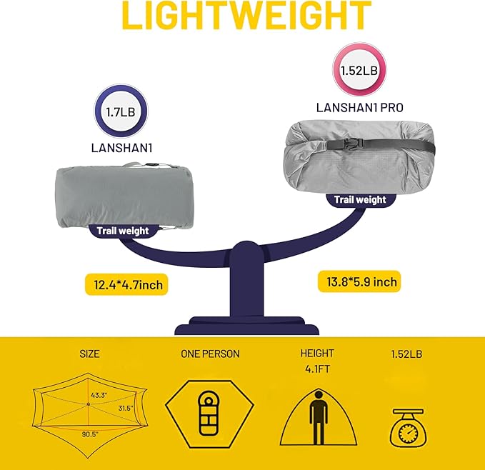 - ULTRALIGHT BUT DURABLE: Weighing at only 1.74 pounds for 1 person LANSHAN 1 PRO tent and 2.21 pounds for 2-person LANSHAN 2 PRO tent. LANSHAN PRO tent is 0.5-0.6 pounds less than the Lanshan while providing you with the same protection. Compact in size allows your backpack to be smaller and lighter in overall size and weight. Small packed with 13.8in*5.9in, so you can carry it easily on backpacking or camping trips