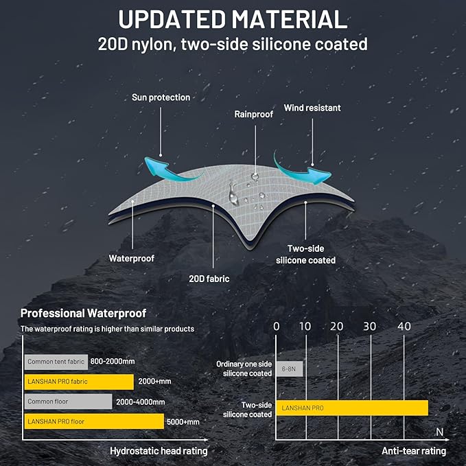 - SUPER WATERPROOF TENT: It's constructed from 20D nylon from the rainfly to the floor making it more durable and waterproof than the standard version. Seam-taped rainfly (20D nylon, two-side silicone coated/PU 2000mm) and bathtub floor (20D nylon, silicone/PU 5000mm). The tent is as strong although it is lighter. Solid as a rock in the windy storm and it can also hold up to hail and thunderstorms. Anti-UV and tear resistant