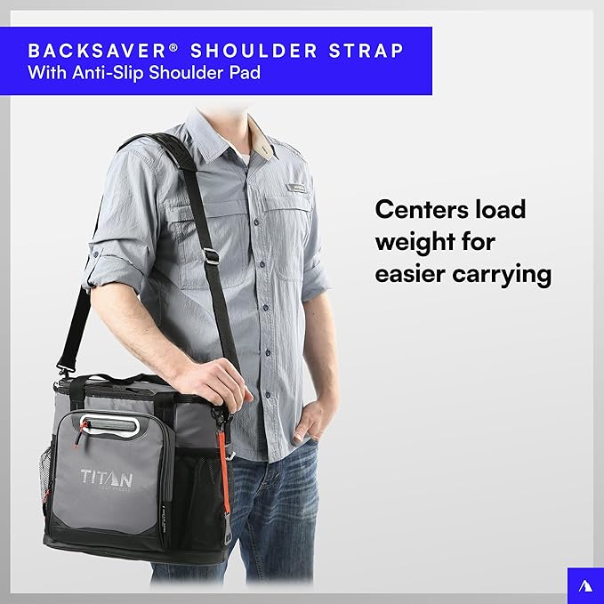 - DESIGNED FOR CONVENIENCE AND USABILITY: Cooler features an adjustable Backsaver shoulder strap with an anti-slip shoulder pad for carrying comfort; Exterior material is water and stain repellent and easy to wipe clean