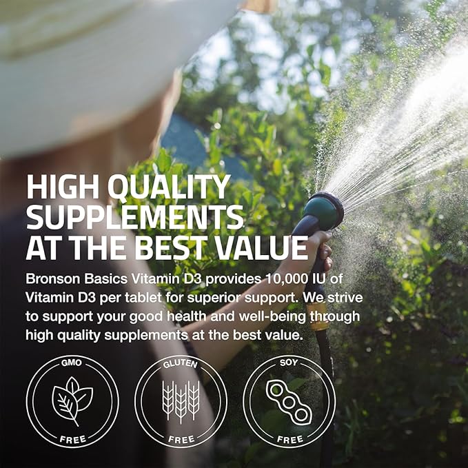 - High Quality & Great Value: Bronson Basics Vitamin D3 provides 10,000 IU of D3 per tablet in a 1 year supply bottle. We strive to support your good health and well-being through high quality supplements at the best value.