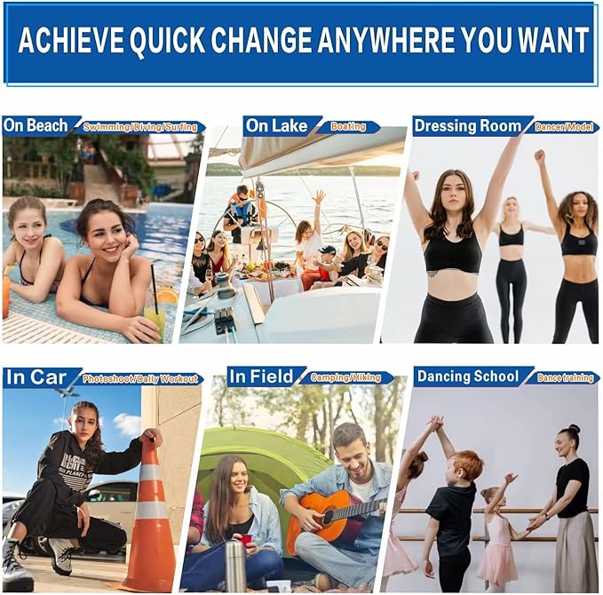 - [ Upgraded & Secret Design ]- The portable changing room is made of high quality fabrics, soft and durable material ensures optimal comfort for you. Light proof and thickened design allows you to change discreetly in public. Even cover it on wet skin, it will not stick on your body to reveal secret identity to surrounding people.