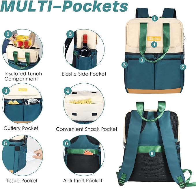 • 🏖️Large Capacity & Multiple Pockets: Measures 16.5 “x 13.8 “x *6.7 “, holds 36 cans of cola.The cooler bookbag comes with 2 front pockets,1 top pocket, 2 side pockets and 1 anti-theft pocket to hold your phone, snacks and cutlery. 2 insulated compartments is big enough to pack beers, tall beverages, drinks, meals, vegetable, etc. Which is perfect for those romantic outings. Plus, we included a 3 in 1 function bottle opener that can open wine and beer, the perfect gift for your drinking buddies.