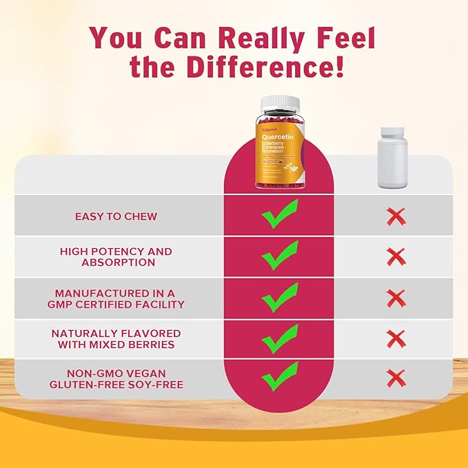 • 8-in-One Upgraded Formula: Our quercetin gummies are formulated with a blend of quercetin, elderberry fruit extract, echinacea purpurea extract, bromelain, 200 mg vitamin C, vitamin D, zinc, and sodium per serving