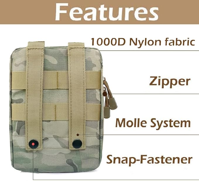 - ✅IDEA DESIGN: Tactical MOLLE EMT Medical First Aid Pouch-Designed with MOLLE belt and strong snap buckle, which allows you to install the medical Pouch on any MOLLE compatible gear without falling.