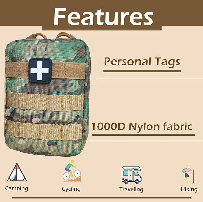 - ✅USE: It can be useful at the shooting range or put together as part of a tactical load out. This standard pouch is used by military personnel, EMT, police, firemen, and by responsible civilians as an easily accessible and necessary component for first aid needs. But it's also a featured accessory for hikers, campers, and other outdoor enthusiasts to carry first aid supplies to treat wounds, and any other injuries fast and at a moment's notice.