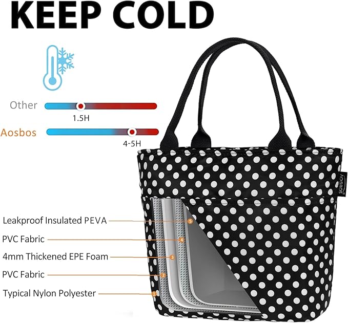 - 【LONG-TERM INSULATION】The lining is made of high-quality PEVA materials and filled with 4mm thickening insulation foam and double-layer PVC, it is also protected by 900D waterproof nylon polyester outer layer. Aosbos lunch tote bag uses those 5-layer heat insulation design to make sure the food at the optimal temperature for 4-6 hours