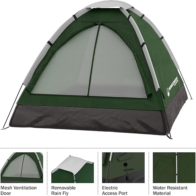 • TWO PERSON TENT - This dome tent has enough space for you and a friend, and features 3mm fiberglass poles, a removable rain fly, dual-layer ventilation door, interior storage pocket, and electric access port to keep your contents neat and organized.