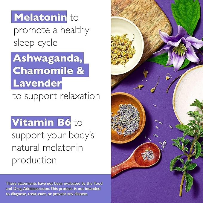 - NUTRIENTS & BOTANICALS: Low-dose Melatonin, herbal adaptogen Ashwagandha, relaxing Chamomile & Lavender, Vitamin B6