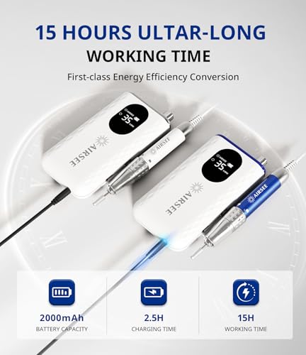 - Upgrade Battery Capacity:The AIRSEE 35000 RPM Pro-Grade Electric Nail Drill has a 2000 mAh rechargeable battery with top energy efficiency.It charges fully in 2.5 hours and lasts up to 15 hours.The LCD screen shows remaining battery capacity and blinks when charging, stopping once fully charged
