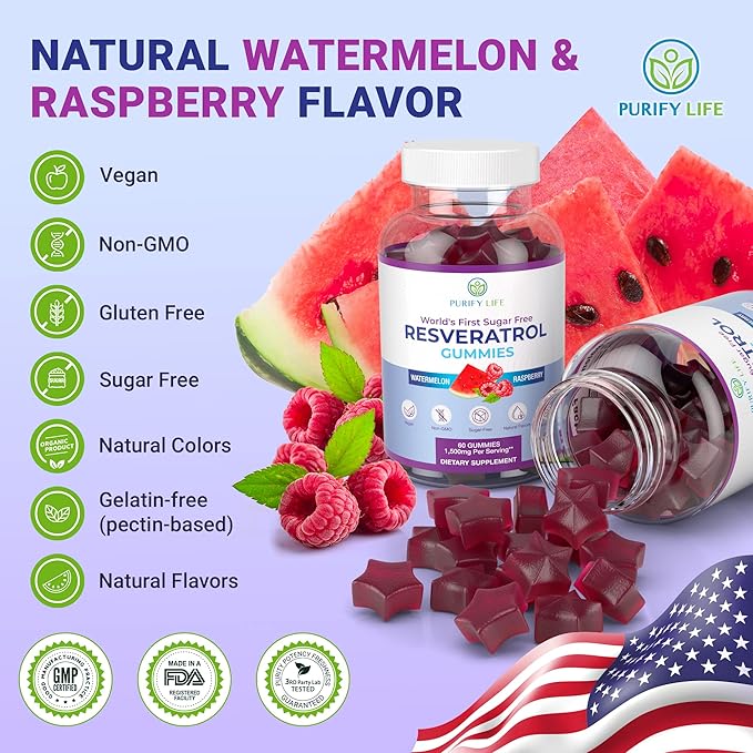 - [Replace typical capsules, powder, and pills] Skip those hard-to-swallow reversatrol supplemental like capsules, Pills, or Powder and try Purify Life’s vegan reservatol gummies with natural Watermelon and Raspberry Flavor for endless resveratrol benefits