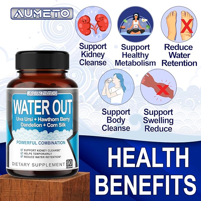 - 1 CONVENIENT SERVING - TOTAL HEALTH BENEFITS -- Effortlessly balance and regulate water retention in your body to support kidney health and metabolism with Aumeto Water Out supplement. Simply take one capsule daily after a meal, making it a convenient and time-efficient addition to your routine.