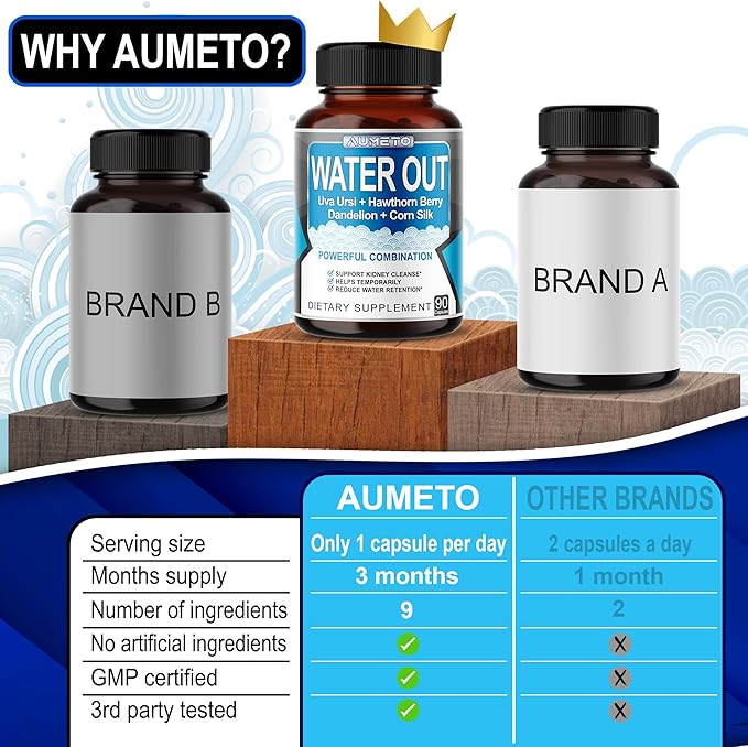 - 1 BOTTLE - 90 DAYS SUPPLY -- Aumeto Water Away offers a potent solution for reducing water retention and 90 capsules per bottle. Each bottle provides a 90-day supply, making it a convenient and cost-effective way to improve your health.