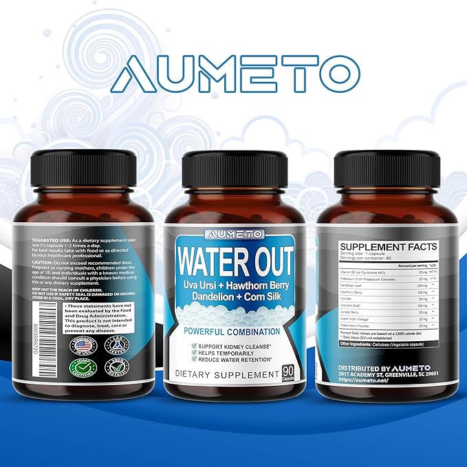 - 1 FORMULA - 9 POWERFUL INGREDIENTS -- Aumeto Water Out Supplement is made with 9 natural ingredients, combined into one capsule.Each serving corresponds to raw powder, making it one of the most concentrated extracts available. One capsule a day is all you need to receive all the necessary benefits.