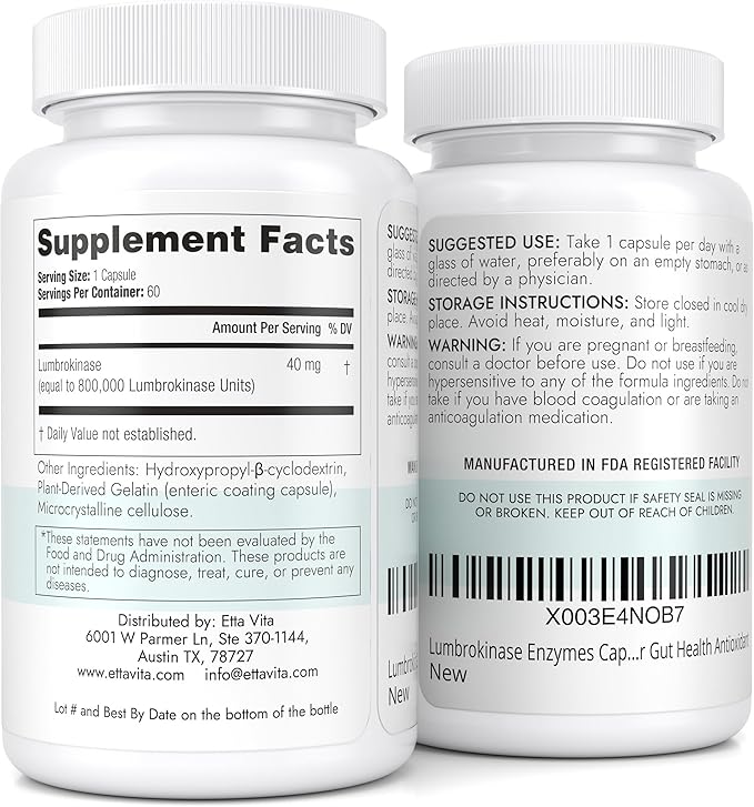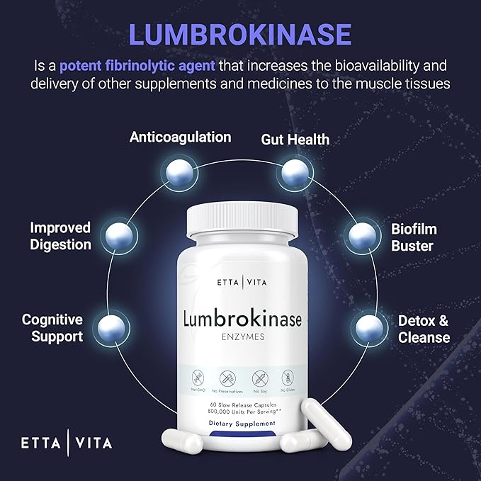 - [Powerful Digestive Enzymes Complex] Etta Vita's lumbrokinase supplement's effective blend has Natto, Serrapaptase and Lumbrokinase enzymes that are powerful and may support healthy detoxification, gut health, joint support, flow & circulation, repairing damaged tissue, energy management, and cognitive support.