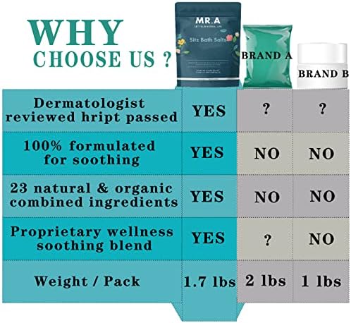- Best Value, Best Quality, Best Experience: Compare Our 27 Ounces (1.7 Pounds) Size To Other Offers At 10 Ounces or 16 Ounces & Compare Our 23 Ingredients To Other Offers 6-10 Ingredients - Our Sitz Soak Contains More Value & Higher Quality.