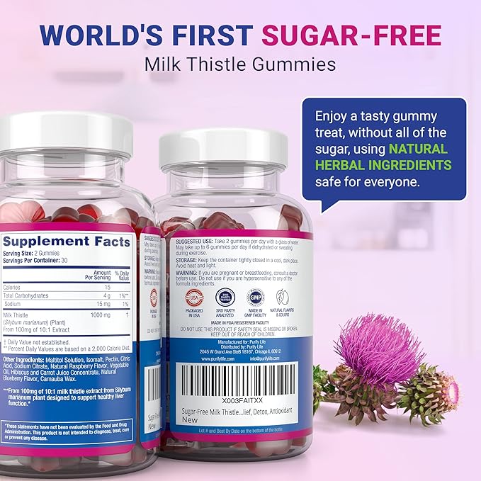 - [World's First Sugar-Free Milk Thistle Gummies] Gummies are the most enjoyable of all Vitamin forms; however, standard gummies contain sugar that disrupts the detox process. Introducing the very first sugar-free Milk Thistle Gummies by Purify Life.