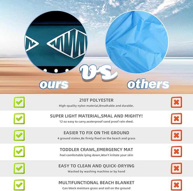 - 🏕️Beach Blanket Oversized:Good wear resistance,Dry-Quick.Can also be used as a rain shed,sunshade,tent,toddler crawl,emergency mat. Feel comfortable lying down,Won't irritate your skin,Better professional fabric sewing.