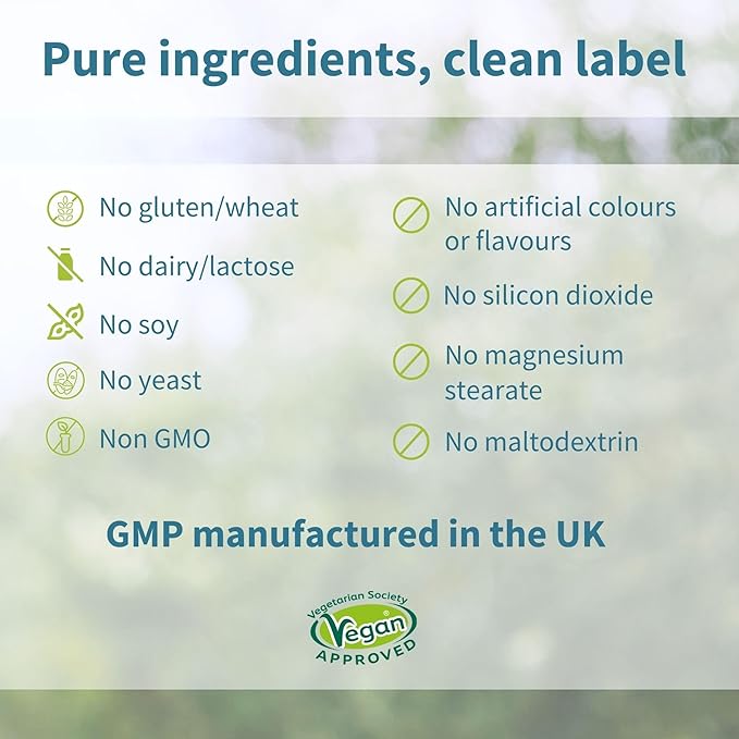 • GMP MANUFACTURED IN THE UK- formulated by nutrition scientists in Cambridge. Subtle & natural orange flavor; vegan; MTHFR-friendly. No sugars, aspartame, artificial colors or flavors