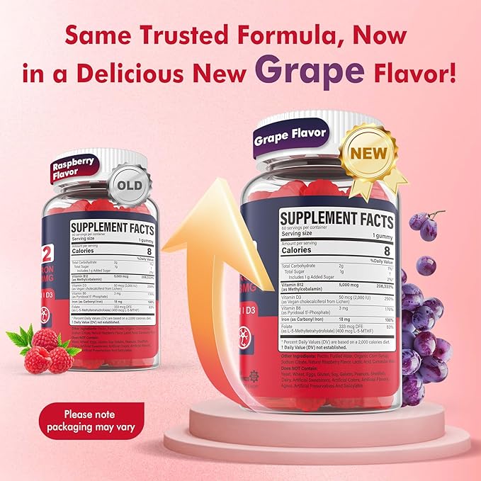 • MADE IN THE USA, QUALITY GUARANTEED: Our iron b-12 vitamin gummies are made in the USA with high-quality, natural ingredients—including plant-based Vitamin D3 from wild lichen. Vegan with a delicious raspberry flavor. Non-GMO, gluten-free, dairy-free, and manufactured in GMP-certified facilities with third-party testing to ensure purity, potency, and effectiveness. Just one gummy a day delivers key nutrients—2 months per bottle, 4 months with two bottles, all at a better value than others.