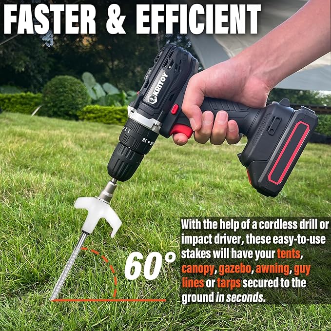 • 👍【EASY TO USE】Our Tent Stakes Setup faster so you can sit back with a beer while watching other campers struggle. With the help of a cordless drill or impact driver, these easy-to-use stakes will have your tents, canopy, gazebo, awning, guy lines or tarps secured to the ground in seconds.