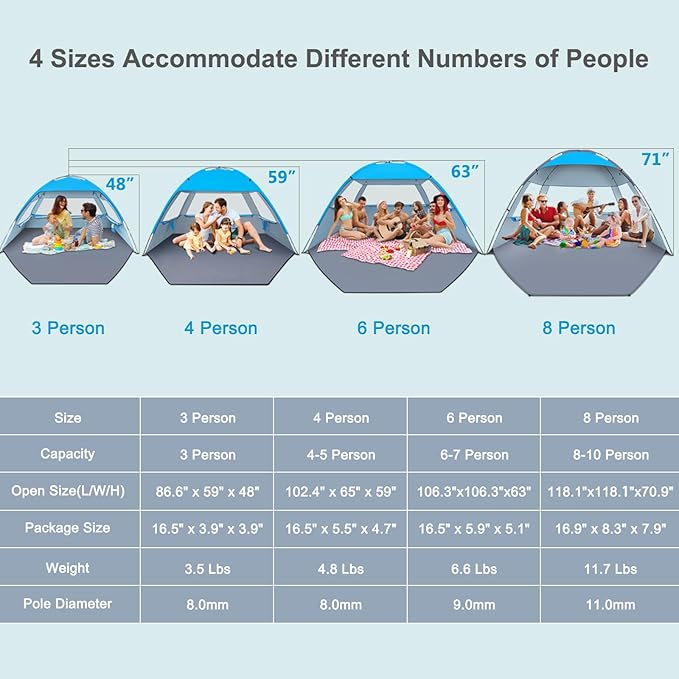 • Super Large Space: Size of 118'L x 118'W x 71'H, 30% bigger than other instant tents at a similar price, fits 8-10 people. It provides a comfortable space for family and friends on the beach