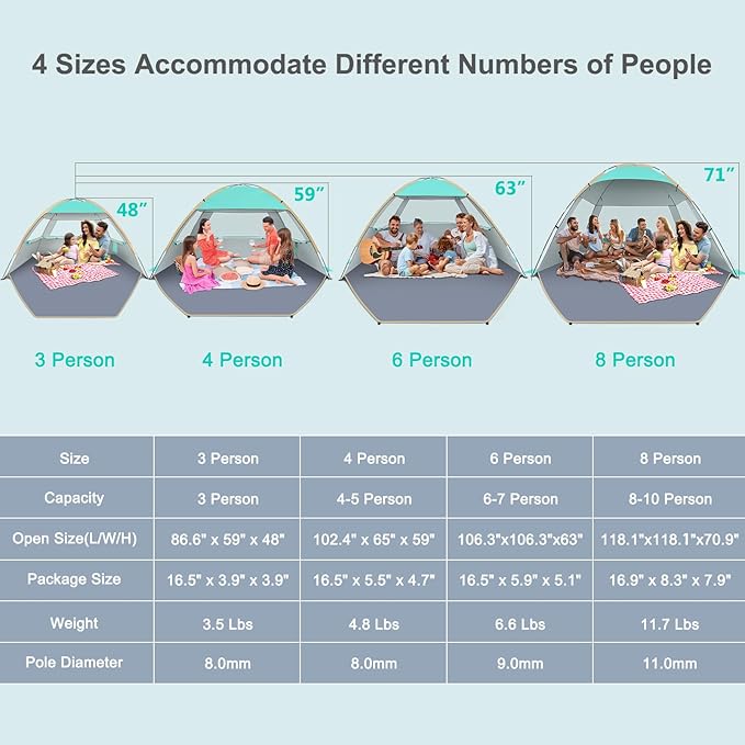 - Super Large Space: Size of 86.6'L x 59'W x 48'H, 30% bigger than other POP-UP tent at similar price, fits 3-4 person. It provides a comfortable space for family and friends on the beach