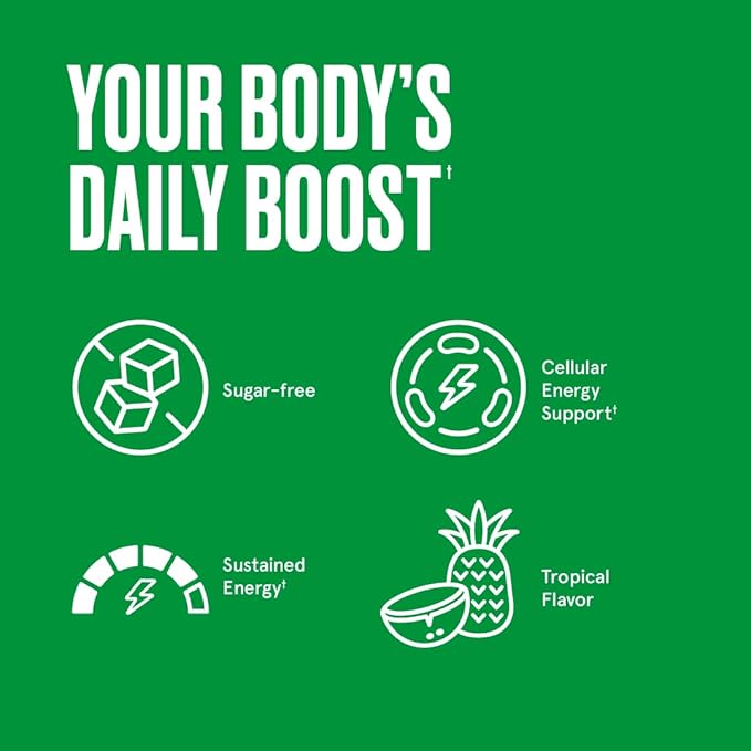 - Give your body its daily boost with this sugar-free gummy. CoQ10 and 100% Daily value of vitamin B12 work together to help support your cellular energy production, while Brain Octane Oil provides sustained energy. Your go-to blend for daily energy support: 100% Daily Value of B12, 100mg CoQ10, 100mg Brain Octane Oil