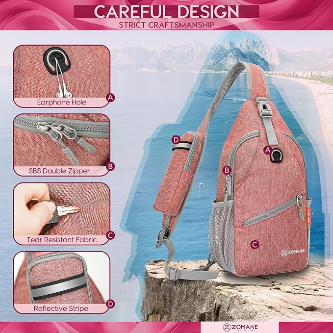 • Practical and Beautiful Crossbody Backpack:The practical and beautiful ZOMAKE sling hiking backpack is the perfect combination of fashion, convenience and performance. The cross chest bag also has a hidden headphone hole on the front, making it easy to access your headphones.This sling bag is the perfect way to stay connected to your favorite music while on the go