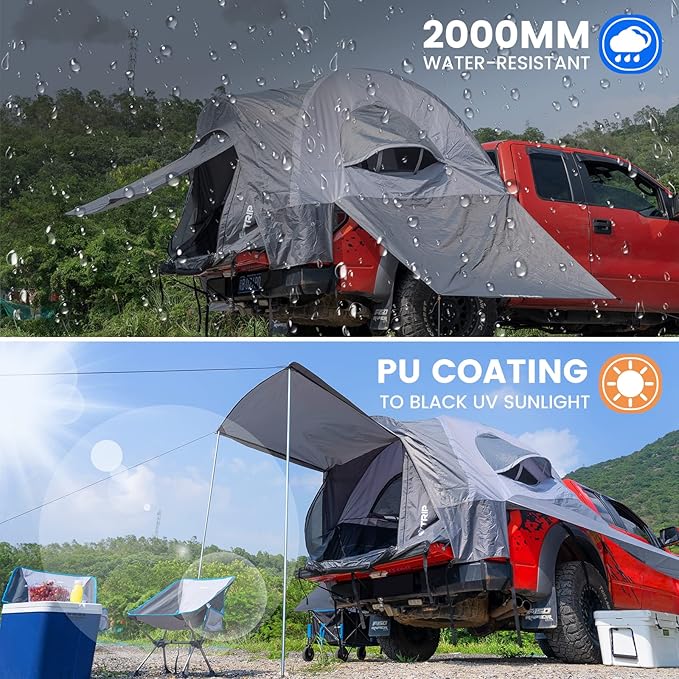 • Extra Tailgate & Side Space: Maximize storage and relaxation space around your pickup truck!Our innovative tailgate and side awning provide ample room for camping gear, while also offering shade from the sun or rain. It's perfect for fishing trips and other outdoor activities, ensuring you have everything you need at your fingertips.