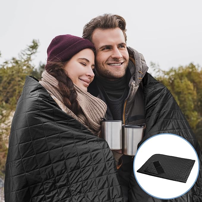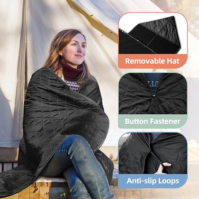 - HOODED BLANKET DESIGN : Our stadium blanket is designed with convenient buttons and a rain-proof hood that easily transforms into a hooded blanket on rainy days, effectively keeping the rain and wind out and your body dry and warm. Plus, with the ability to combine two blankets together, you can create an extra-large blanket measuring a spacious 110' x 79' Whether you're enjoying the great outdoors or snuggled up indoors, our blanket is the perfect companion for any adventure.