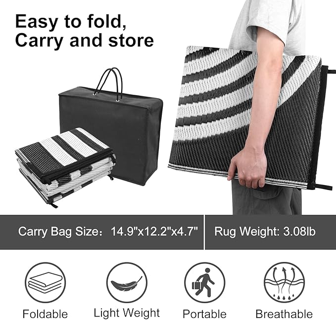 - Unique Design: Our outdoor rug features a double rainbow pattern, simple and classic black and white design, easily match any of your patio furniture and outdoor space, complement your modern style. The reversible design gives two looks, and when one side of your rug wears down, just flip it over and it'll give your patio a whole new look. (Note: There may be some creases when first used, simply unfold the rug and lay it flat or press it with heavy object and it will recover flat completely.)