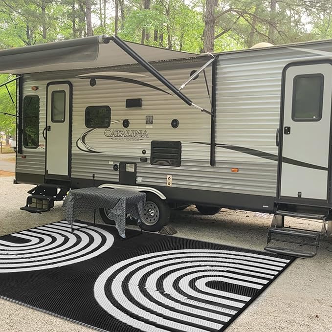 • Unique Design: Our outdoor rug features a double rainbow pattern, simple and classic black and white design, easily match any of your patio furniture and outdoor space, complement your modern style. The reversible design gives two looks, and when one side of your rug wears down, just flip it over and it'll give your patio a whole new look. (Note: There may be some creases when first used, simply unfold the rug and lay it flat or press it with heavy object and it will recover flat completely.)