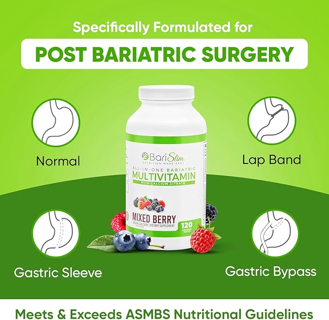 - ✅【Complete Bariatric Nutrition】: BariSlim's All-in-One Bariatric Chewable Multivitamin Tablets are specially designed to meet the unique nutritional needs of post bariatric surgery patients, including Gastric Bypass, Gastric Sleeve, and Lap Band surgery. These bariatric vitamins provide comprehensive support, ensuring you get all the essential vitamins and minerals required for your health and well-being.